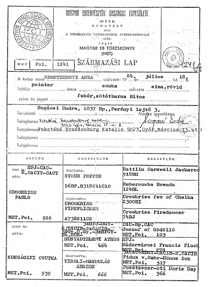 Anka, bár nem kölyökként, hanem 15 hónaposan került hozzánk, az első perctől úgy viselkedett, mintha mindig a mi kutyánk lett volna. Akkor volt folyamatban Budapestről Győrbe való költözésünk. Kertes házunkba, miközben még folytak a munkálatok, tapétázás és egyebek, ő szinte elsőként költözött be. Érdekes módon került hozzánk. Én, mivel már gyermekkoromban is imádtam az állatokat, különösen a kutyát - volt is 8 éven át egy tacskóm a szülői házban - mindenképp kutyát szerettem volna, mihelyt új otthonunkba költözünk. Egy rádióműsorban hallottuk, hogy két pointer kutyát elajándékoznának. A pointert balatoni szomszédunk révén ismertük meg nemsokkal azelőtt, neki volt egy barna foltos fiatal kanja, Bim. Később ő lett Anka párja 5 éven azaz 5 almon át. A két meghirdetett kutyából az egyik tehát Anka volt. Másik a testvére, Aba, akit szintén elhoztunk akkori szomszédunknak. Eleinte úgy gondoltuk, a kant hozzuk el, de szerelem volt köztünk Ankával első látásra. Mikor bementem a kennelbe, egyből egymásra találtunk. Máig is úgy érzem, életem egyik legjobb döntése volt, hiszen azon kívül, hogy csodálatos kutyánk volt haláláig, neki köszönhetem az összes további pointert, akik életem egyik fő meghatározói, és sok-sok boldog perc okozói lettek. Anka nagyon hamar beilleszkedett életünkbe annak ellenére, hogy nem volt már kölyök. A család összes tagját szerette, hűséges társunk volt egész életében. Könnyen nevelhető, könnyen kezelhető, alkalmazkodó, nagyon engedelmes, jó szándékú, békés kutya volt. A kutyák között nagy tekintélynek örvendett, vezér típusnak számított közöttük, de ezt mindig egyetlen mordulás nélkül érte el. Különlegesen jó anya volt, sőt unokáit és dédunokáit is szívesen nevelgette.